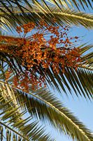 Als ik in de gedeeltelijke schaduw van de dadelpalmen vertoef, kijk ik graag naar de grote bladeren, maar de vruchten zijn ook een echte blikvanger. Op de stranden, maar ook in de tuinen en parken van de Costa Blanca, word ik geïnspireerd door de botanische diversiteit, vooral de palmbomen. Deze close-up op portretformaat is gewijd aan dadelpalmen met hun prachtige vruchttrossen en decoratieve bladeren. Zonlicht verlicht de oranje dadels en benadrukt hun levendige kleur.