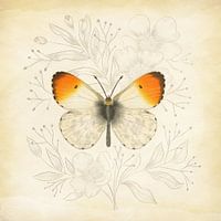 Mooie getekende illustratie van een vlinder, het Oranjetipje, op een vintage achtergrond met schets van bloemen en blaadjes.