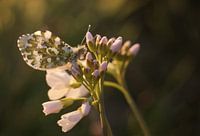 Close-up foto van een oranjetipje op een bloem. Deze foto is 's avonds gemaakt, waardoor de zon niet fel was en een warme gloed geeft. Het licht schijnt mooi door de vleugels van de vlinder en contrasteert daarmee met de donkere achtergrond.