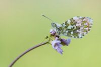 Oranjetipje vlinder rustend op een pinksterbloem tegen een groene achtergrond
