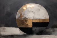 Abstract schilderij met een grote bol, bladgoud en kubistische elementen.