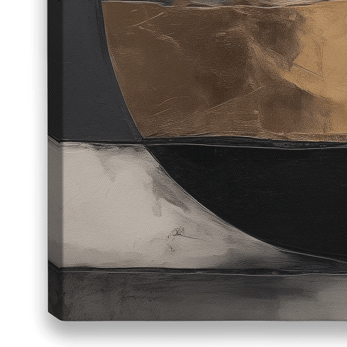 Mixed media met grove penseelstreken op ruw canvas in zwart,grijs,beige, taupe en goud tinten.