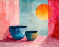Details: stilleven, minimalistisch, geometrisch, kom, cirkel, roze, blauw, rood, oranje