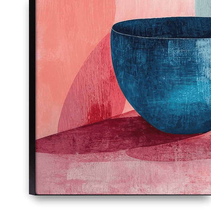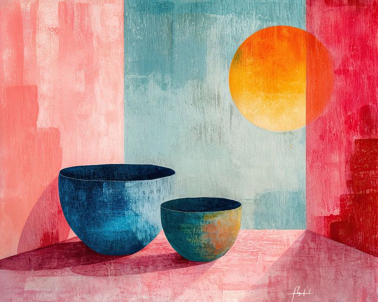 Details: stilleven, minimalistisch, geometrisch, kom, cirkel, roze, blauw, rood, oranje