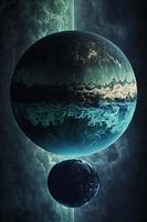Eronder rust een kleinere, schimmige planeet of maan in zijn zwaartekracht, gehuld in diep blauw en zwart, waarvan het oppervlak minder helder maar even mysterieus is. De achtergrond is een schilderij van interstellaire wolken en sterrenlicht in de verte, met een verticale rand van etherisch groen licht die de scène in tweeën deelt en de dualiteit van de planeten benadrukt. Deze lichtgevende kolom geeft de compositie een surrealistische, bijna goddelijke kwaliteit, alsof de planeten op één lijn staan in een moment van kosmische betekenis.