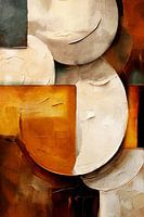 Abstracte kunst met ronde en rechthoekige vormen die elkaar overlappen in warme aardetinten.