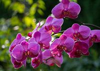 Phaleanopsis orchidee lila magenta bloeiend in ochtend strijklicht, opvlammend tegen de donkere natuurlijke achtergrond. Kleur groen, magenta.