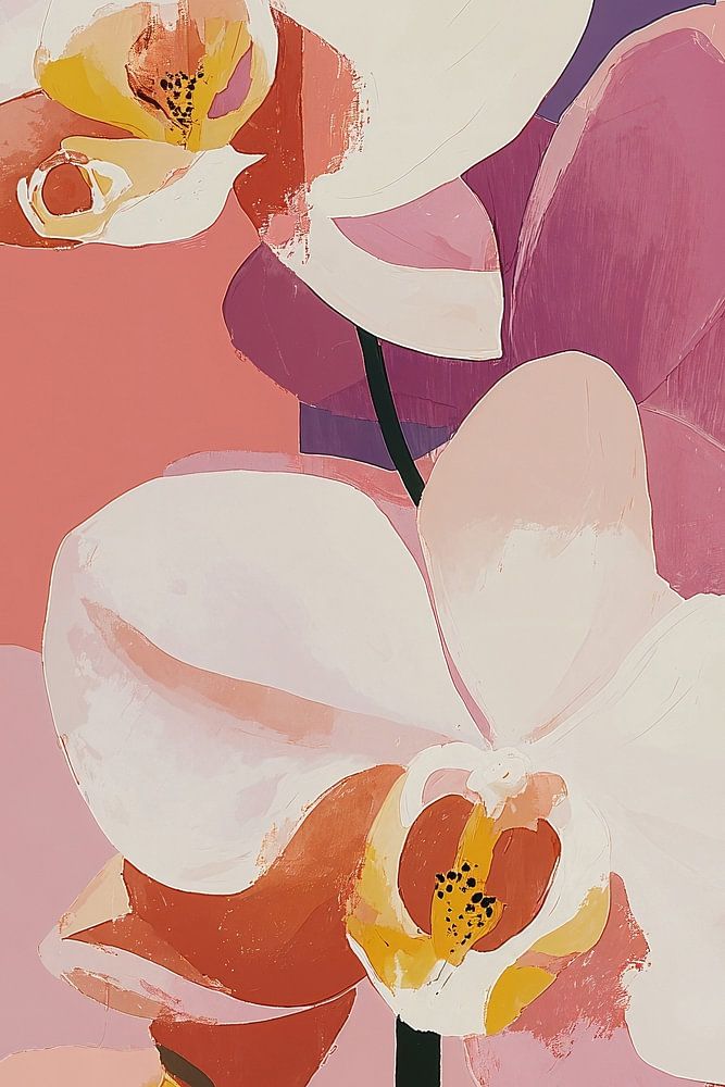 Een digitaal kunstwerk van witte orchideeën tegen een harmonieuze achtergrond in warme koraal-, roze- en paarstinten. De delicate bloemen zijn met zachte penseelstreken weergegeven, waarbij de gele hartjes een subtiel accent vormen. De moderne, minimalistische stijl en het gedurfde kleurgebruik geven het werk een eigentijdse uitstraling.