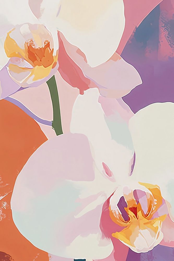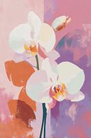 Een digitale interpretatie van witte orchideeën tegen een dromerige achtergrond in warme roze en paarse tinten. De delicate bloemen zweven als lichte verschijningen in de ruimte, waarbij hun zuivere witte bloembladeren en gouden hartjes contrasteren met de atmosferische achtergrond. De compositie straalt een serene elegantie uit die tegelijk modern en tijdloos aanvoelt.