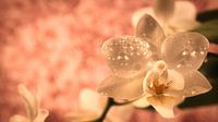 Orchidee met dauwdruppels op de bloemblaadjes. Orchideeënstengel met bloemen tegen een prachtige achtergrond. Bloemenfoto van een exotische plant