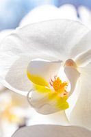 Een orchidee in de zon. De kleuren spotten van het beeld af maar je kan nog goed de textuur van de bloem zien. Op de achtergrond zie je nog een fijne strook blauwe lucht.