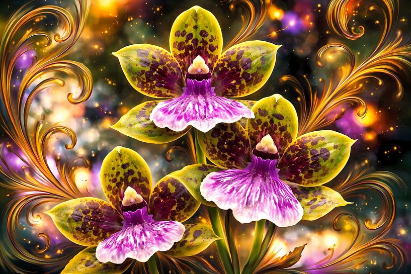 Drie levendige orchideeën bloeien te midden van wervelende, gloeiende patronen. De bloemen hebben een boeiende mix van roze, gele en groene tinten tegen een kosmische achtergrond.
