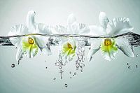 Een elegante en serene wanddecoratie met een prachtige compositie van witte orchideeën die zweven in helder water. De zachte kleuren en het gedetailleerde ontwerp brengen een gevoel van rust en verfijning in elke ruimte. Perfect voor liefhebbers van natuur en bloemen, deze afbeelding voegt een vleugje frisheid toe aan uw interieur, of het nu een woonkamer, hal of kantoor is.