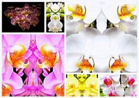Een collage met verschillende afbeeldingen uit mijn serie orchideeënpatronen. Een interessante combinatie van heldere en frisse afbeeldingen van orchideeën, sommige als spiegelbeeld en allemaal heldere kleuren waaronder roze, geel en wit met diepgekleurde keelbloemen.