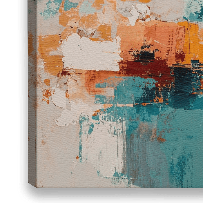 Een abstract schilderij met een dynamische compositie, het kleurenpalet wordt gedomineerd door koele tinten, afgewisseld met warme kleuren. Dikke, gestructureerde penseelstreken creëren een gevoel van diepte en beweging, spatten witte verf voegen highlights en een gevoel van energie toe. De algehele indruk is er een van gecontroleerde…