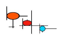 Een abstract werk van ovalen, een cirkel en rechte lijnen, in wit, zwart, oranje, rood en blauw, geïnspireerd door Piet Mondriaan.