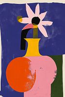 Dominant in het beeld is de grote, oranje vaas die voor een deel overlapt met een roze vlak en een donkere, nachtblauwe achtergrond. Uit de vaas ontspringt een grote, gestileerde bloem met roze en witte tinten en…