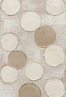 minimalistische en organische compositie waarin ronde vormen in neutrale tinten zoals beige, wit en zachtbruin harmonieus over het canvas zijn verspreid. De cirkels lijken willekeurig geplaatst, maar vormen toch een uitgebalanceerd patroon dat rust en eenvoud uitstraalt. De textuur van het werk is zichtbaar ruw en gelaagd, met duidelijke penseelstreken die de cirkels omlijnen en een licht reliëf creëren. Deze tastbare kwaliteit geeft het werk een ambachtelijke uitstraling en benadrukt de natuurlijke tinten.