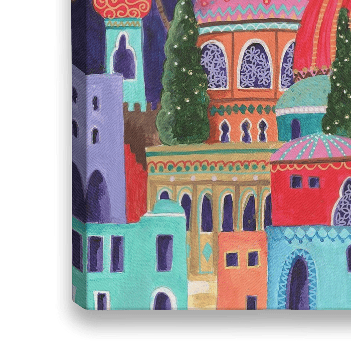 Een mooi kleurrijke oriëntaalse stad met een grote ster van Bethlehem. De huizen zijn in vrolijke kleuren geschilderd en je ziet palmbomen en andere tropische bomen met kerstlichtjes. Origineel acrylverf op papier.