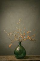 Stilleven met takken van een Aziatische Boomwurger in een oude groene mandfles.