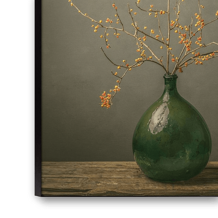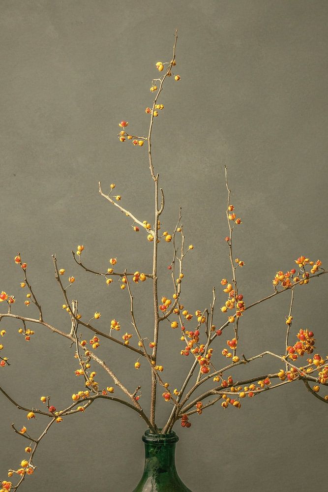 Stilleven met takken van een Aziatische Boomwurger in een oude groene mandfles.