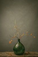 Stilleven met takken van een Aziatische Boomwurger in een oude groene mandfles.