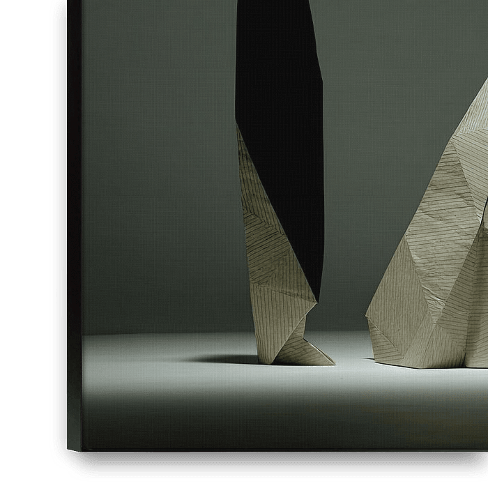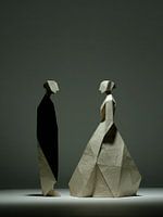 Twee gestileerde origami-achtige figuren staan tegenover elkaar in een open, bijna museale ruimte. De geometrische vouwen en houtachtige textuur geven de vormen een sculpturale, tijdloze uitstraling. De ene figuur is slank en donker, de andere breed en licht, waardoor er een subtiel spanningsveld ontstaat tussen aanwezigheid en…