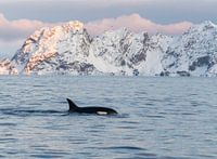 wat een prachtig gezicht. De besneeuwde bergen rondom het fjord en dan ook nog een orka op de voorgrond. Schitterend!