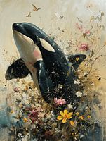 Deze artistieke weergave van een orka die omhoog zwemt tussen bloemen is een ware fusie van natuur en fantasie. De combinatie van het donkere zwart en wit van de orka met de uitbarsting van bloemkleuren zoals geel, roze, wit en hints van blauw creëert een opvallend contrast. De achtergrond in beige en lichte aardetinten geeft het geheel een zacht en dromerig karakter. Dit kunstwerk zou ideaal zijn voor een hedendaags interieur dat een statement wil maken of een kantoorruimte die een unieke en inspirerende sfeer nastreeft.
