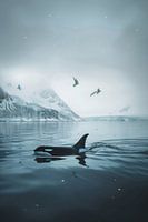 De afbeelding toont een majestueuze orka die door het ijsblauwe water zwemt in een ijzig mistig landschap. De ruige, met sneeuw bedekte bergen op de achtergrond en de cirkelende vogels versterken de ongerepte schoonheid van dit Arctische landschap, terwijl zachte golven de elegante voortgang van de orka onderbreken.