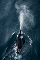 Op de foto zie je een majestueuze orka uit het diepblauwe water opduiken. Zijn opvallende zwart-witte kleur en karakteristieke rugvin springen in het oog. De waterstraal die uit zijn spuitgat komt, heeft een bijna magisch effect en laat kleine waterdruppels in de lucht dwarrelen. Een fascinerende ontmoeting met de onderwaterwereld!