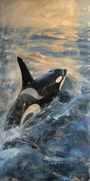 Een orka springt op uit het water, waarbij het laatste licht van de zon de oceaan in een zee van goud verandert. De kracht en gratie van dit machtige dier worden gevangen in het moment dat hij de lucht raakt.
