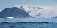 Een groep Orka's in het landschap van Antarctica. Genomen met een telelens vanuit een rubberboot met motor.
