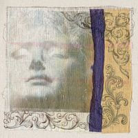 collage van decoratieve motieven afgedrukt op deli paper, op stof geplakt met gekleurd vloeipapier er overheen