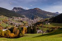 Uitzicht op de bekende wintersport plaats, Ortisei /Sankt Ulrich. De plaats is mooi gelegen in het 'Val Gardena' in de Dolomieten. De foto is in de herfst genomen met vele goudgekleurde bomen.