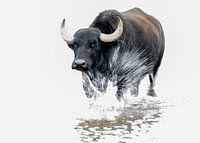 Hoog water in de Biesbosch. De ossen die normaal op het land lopen gingen nu te water. Op zoek naar droog stuk land.