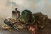 Wees vrij en geniet van de vrijheid in de bergen. Met klimgerei om aan bergklimmen te doen zoals mee touw een houweel en natuurlijk een traditionele hoed als op dit stilleven.