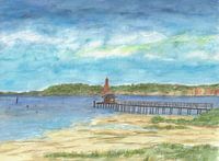 De prachtige landschappen langs de Flensburg Fjord staan altijd model voor veel van mijn aquarellen. Dit motief toont het Flensburgse strand Ostseebad met het schilderachtige uitzicht op de Flensburgse Fjord. Op de andere oever ziet u de Mürwiker Zeevaartschool.