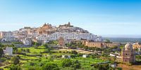 Ostuni, de witte stad. Panoramische skyline en Madonna della Grata kerk, provincie Brindisi, Puglia of Apulië. Italië, Europa.