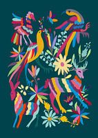 Levendige Otomi-kunstwerken met ingewikkelde bloemen- en dierenmotieven tegen een weelderige groene achtergrond, die de essentie van natuur en cultuur vastleggen in een harmonieuze fusie van traditioneel ontwerp.