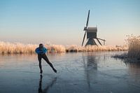 Schaatser op het ijs van een bevroren vaart in de vroege ochtend op het platteland langs een molen en riet met rijp erop in Kinderdijk, Nederland.