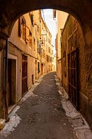 Doorkijkje in een oude Portugese straat. De oude gevels zijn voorzien van karakteristieke oude luiken.