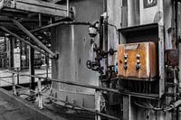 roestig bedieningspaneel in een oude verlaten fabriek. Mooie zwart wit omgeving met de nadruk op het apparaat. afgelegen pand.