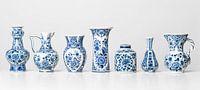 Diverse delfts blauwe vaasjes van oud delft op een rij met een witte achtergrond