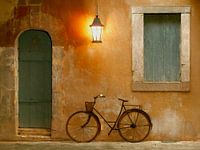 Het dorpje lijkt verlaten, toch brandt er licht in het steegje. Tegen de muur een oude roestige fiets die al tijden meer gebruikt is.