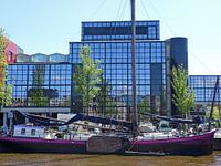 Aan de Willemskadekade in Leeuwarden gaan historisch schip en moderne panden, waarin de historische panden aan de overzijde weerspiegelen, prachtig samen tot een boeiend kijkspel.