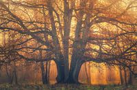 Een prachtige symmetrische eik die als het ware als de boom des levens in de Limburgse bossen van België staat, zo gracieus, gehuld in het gouden ochtendlicht dat zijn herfstkleuren nog sterker accentueert.