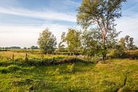 Schilderachtige foto van een kleurrijk landschap aan de uiterwaarden van de Nederlandse rivier de Waal bij het dorp Herwijnen. Door het gebied loopt een scheefgezakt oud hek.