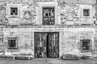 Oud en klassiek Spaans huis in het NoordSpaanse dorp Moarves de Ajedo in zwart/wit en met de voordeur op een kier.
