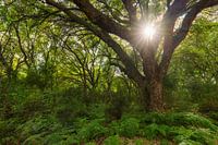 Een oude kurkeik staat in het varens. De zon schijnt door de takken.